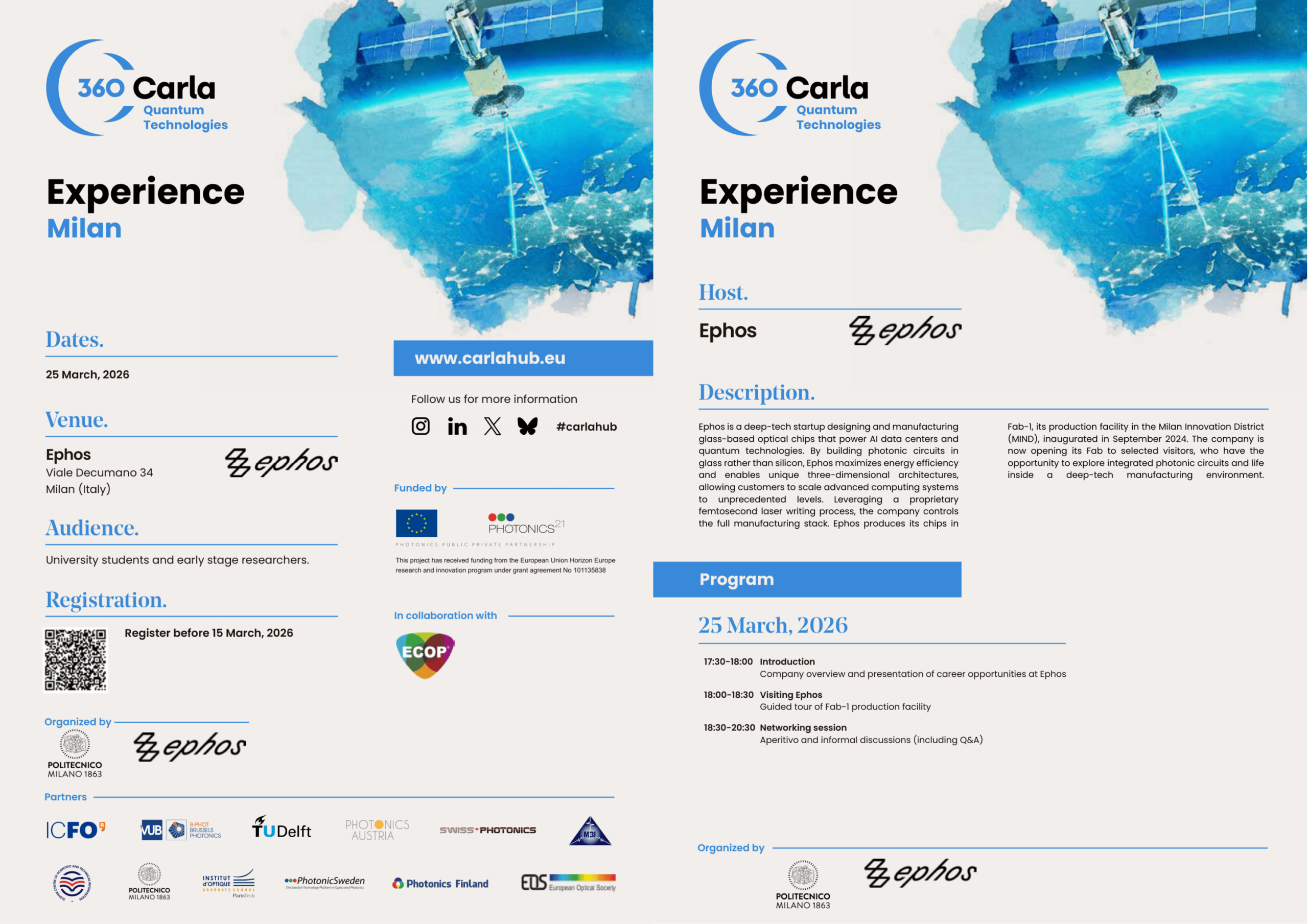 During this 360 CARLA Experience, participants will have the opportunity to visit Ephos Fab-1, the company’s production facility located in the Milan Innovation District (MIND) and inaugurated in September 2024. The visit will provide first-hand insight into the development of integrated photonic circuits and into the daily operations of a deep-tech manufacturing environment.