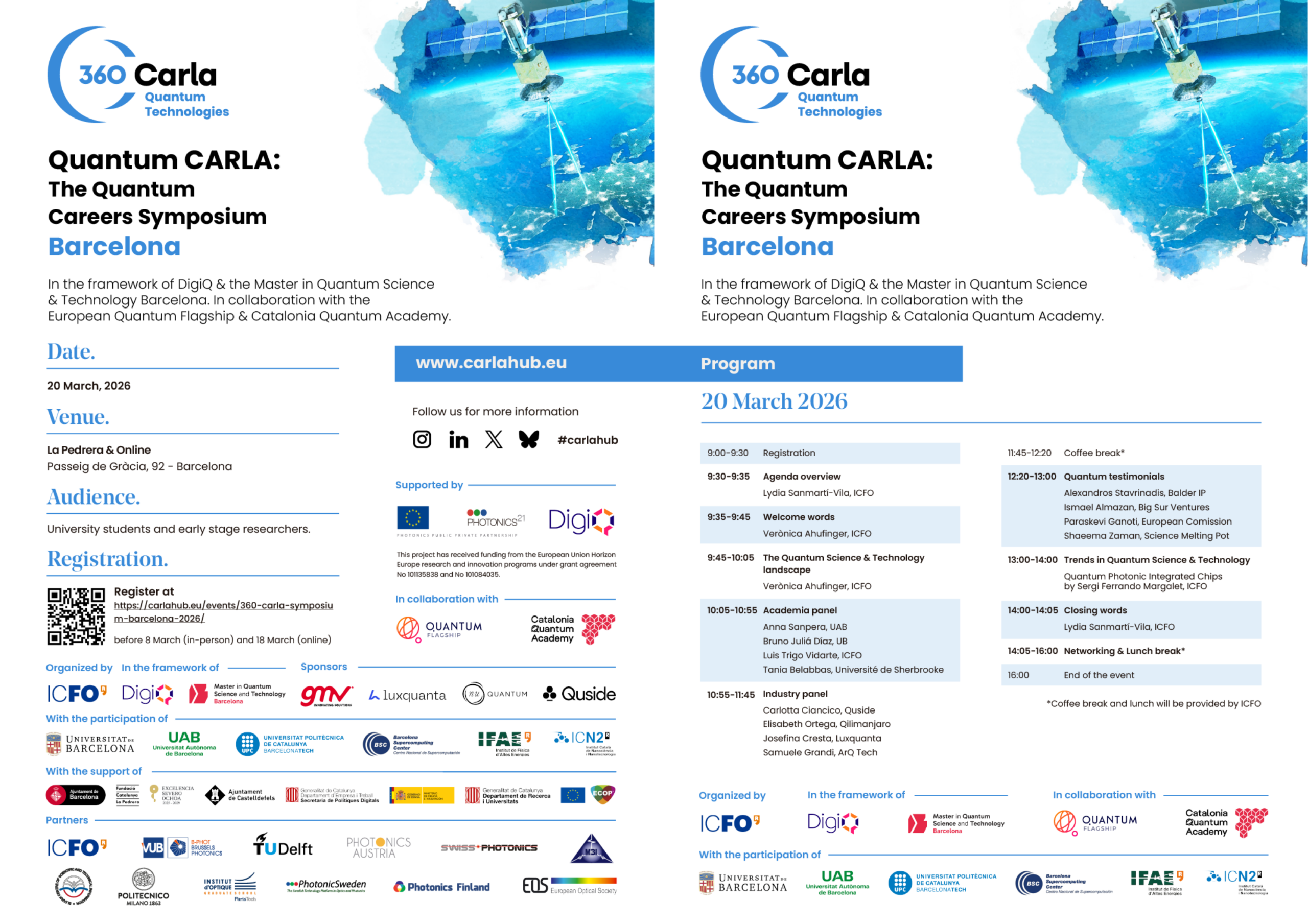 This symposium is organized by ICFO within the 360 CARLA project, in the Quantum Technologies and Communications vertical dedicated to careers in quantum science and technologies, in the framework of the European project Digitally Enhanced Quantum Technology Master (DigiQ) and the Master in Quantum Science and Technology Barcelona, and in collaboration with the European Quantum Flagship and Catalonia Quantum Academy.