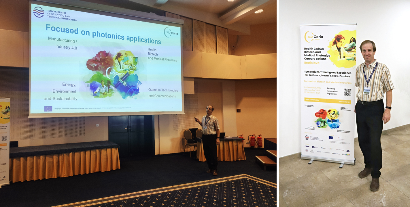 Within the session dedicated to education and popularization of science, Daniel delivered a talk titled “The CARLA Programs as a Framework for Multidisciplinary Career Pathways in Photonics.” His contribution introduced the goals and achievements of the EU-funded 360 CARLA project, which builds on the success of the CARLA initiative to strengthen Europe’s photonics talent pipeline. The presentation emphasized how 360 CARLA promotes career development, mentorship, and interdisciplinary collaboration across key photonics application areas – from health and biotechnology to quantum technologies and sustainable industry.